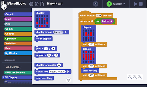 If you want to learn coding the easy way, MicroBlocks is a block-based language that is easy for beginners (9 years to adults) to program DUELink boards. A huge benefit of MicroBlocks is that it is live and interactive; users can click commands to see what they do and they can test their scripts as they work.